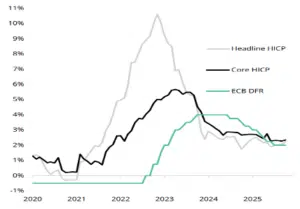 Aux Etats-Unis, le secteur de la technologie/intelligence artificielle soutient donc la croissance économique. En outre, la consommation des ménages est au rendez-vous, en dépit de la hausse des droits de douane, avec en point d’orgue un nouveau record de consommation lors du « black Friday ». En revanche, l’inflation reste un peu trop élevée, proche de 3%, et le marché du travail se détériore.