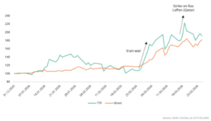 Hausse des prix du gaz (TTF) et du pétrole (Brent) en Europe depuis le début de l’année :